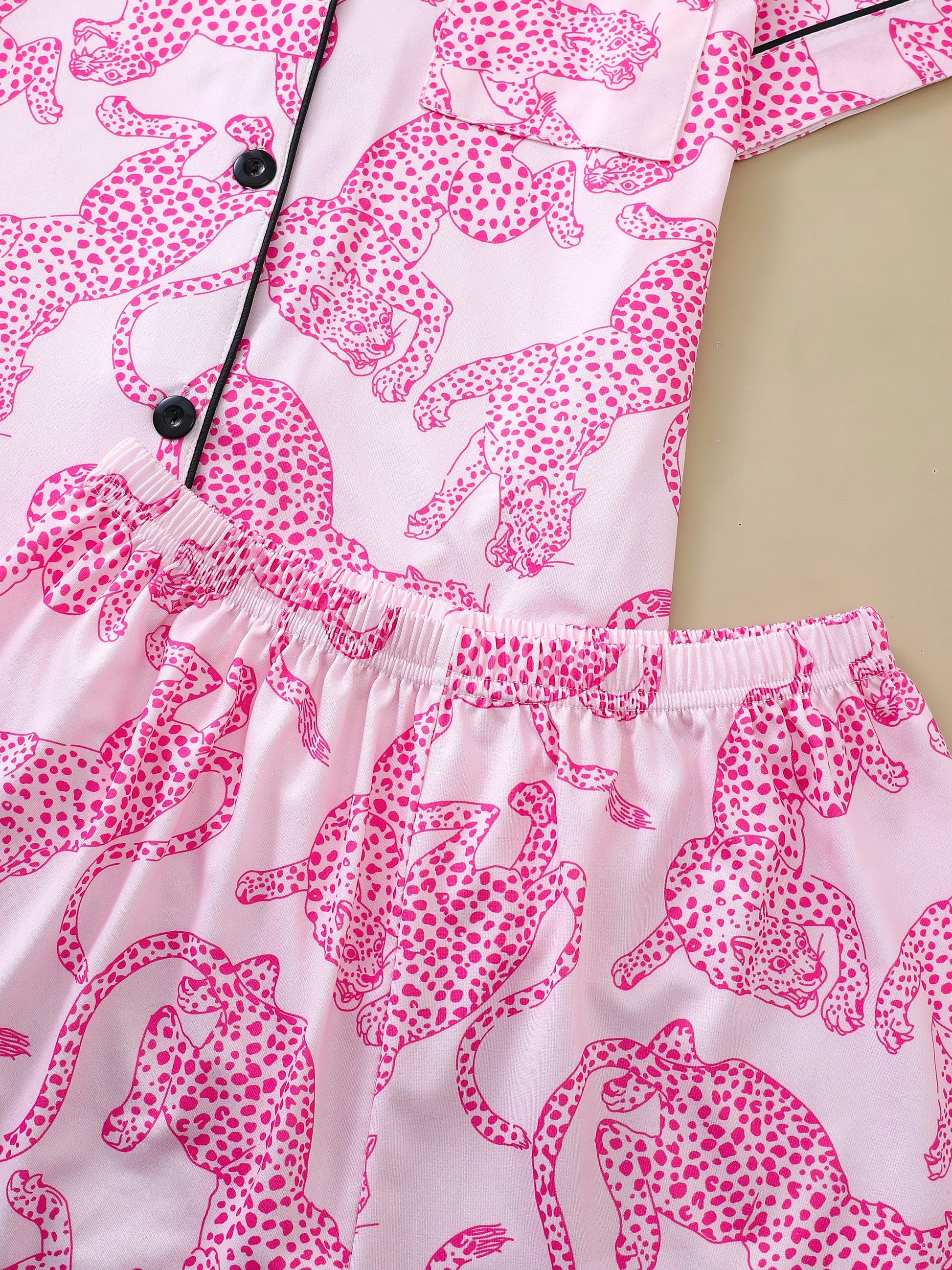 This luxe 2-piece pajama set features a button-up short-sleeve top and matching shorts in a soft blush-pink hue, detailed with bold panther print and sleek black piping for a polished touch. It’s giving: cozy and confident.
